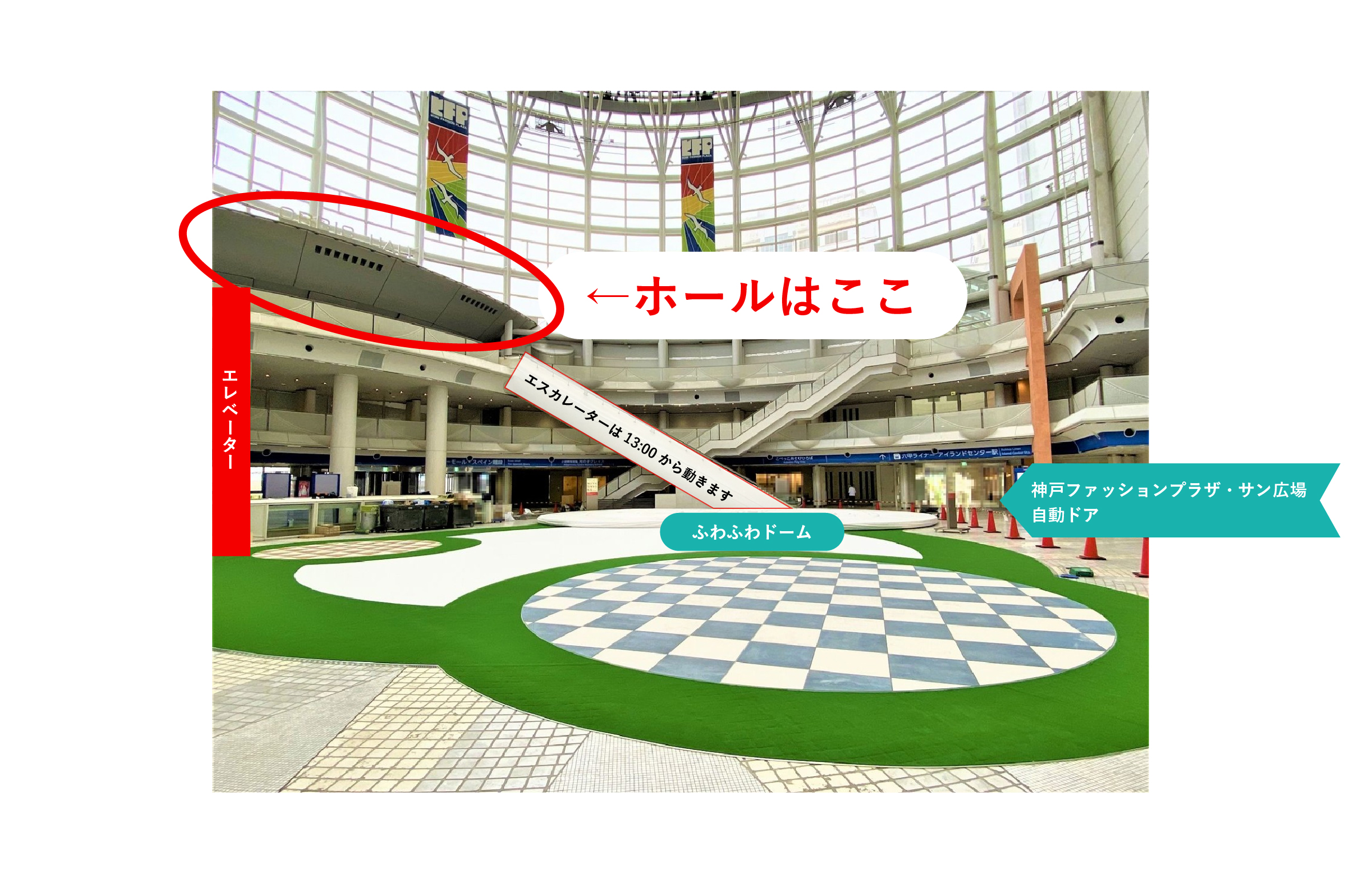 13:00まではふわふわドーム(トランポリン)横のエスカレーターを停止しておりますので、エレベーターで5階にあがってください。